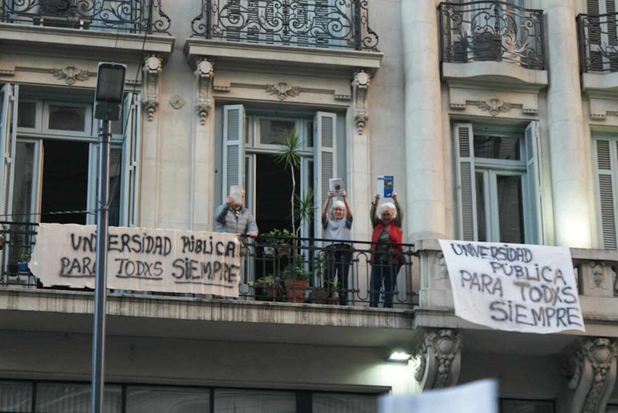 People holding books aloft from surrounding buildings join massive nationwide protests in defence of universities and public education in Argentina. One of the largest rallies of President Javier Milei’s government—drawing an estimated 100,000 to 500,000 people—fills Buenos Aires on April 23, 2024. A banner reads, “Public University for Everyone, Always.” Photo: Dreamstime.