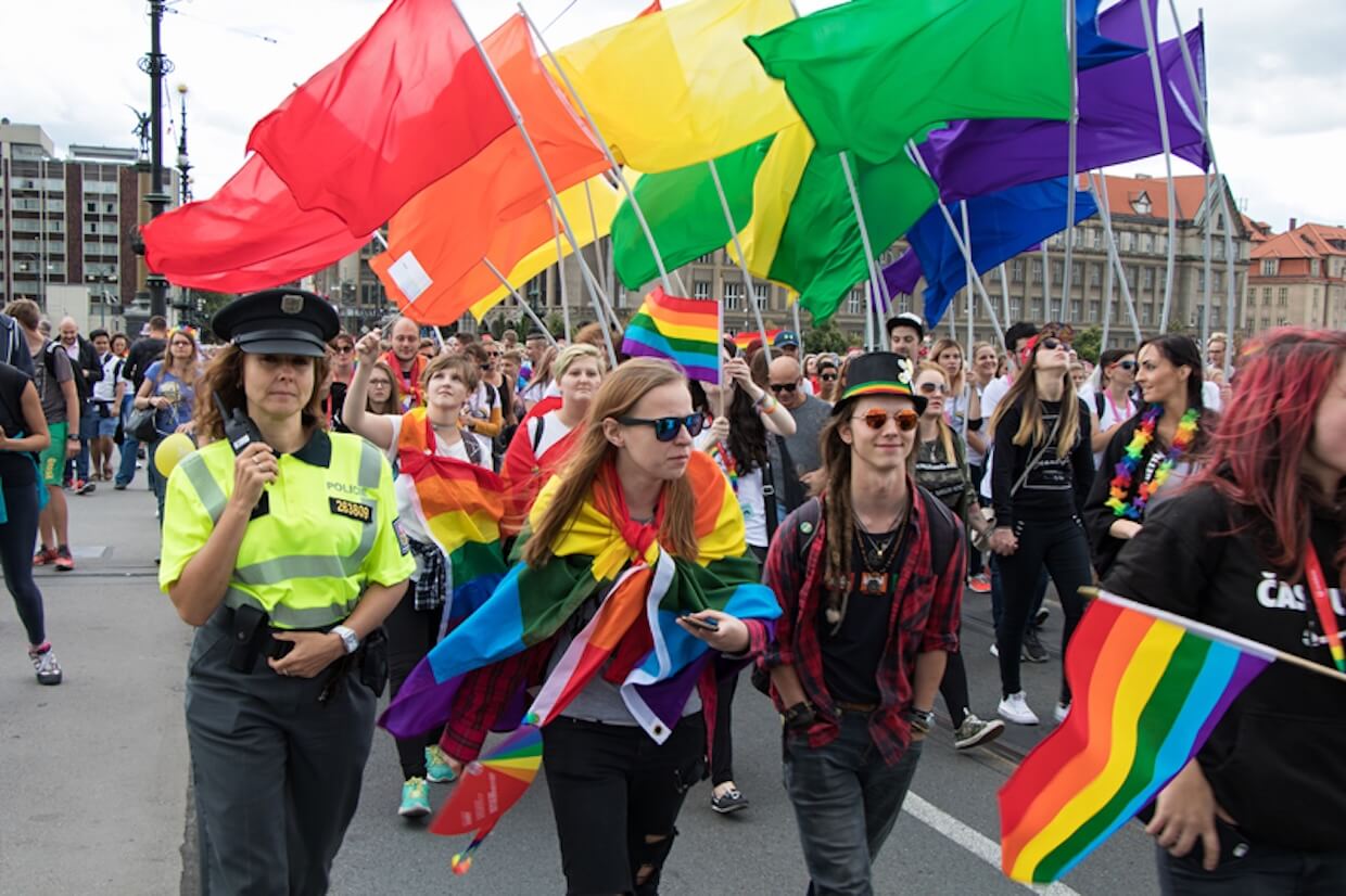 Participants march through the streets during Prague Pride, a major LGBTQ+ parade and celebration, in Prague, Czech Republic, on August 12, 2017. Photo: Madeleine Steinbach.